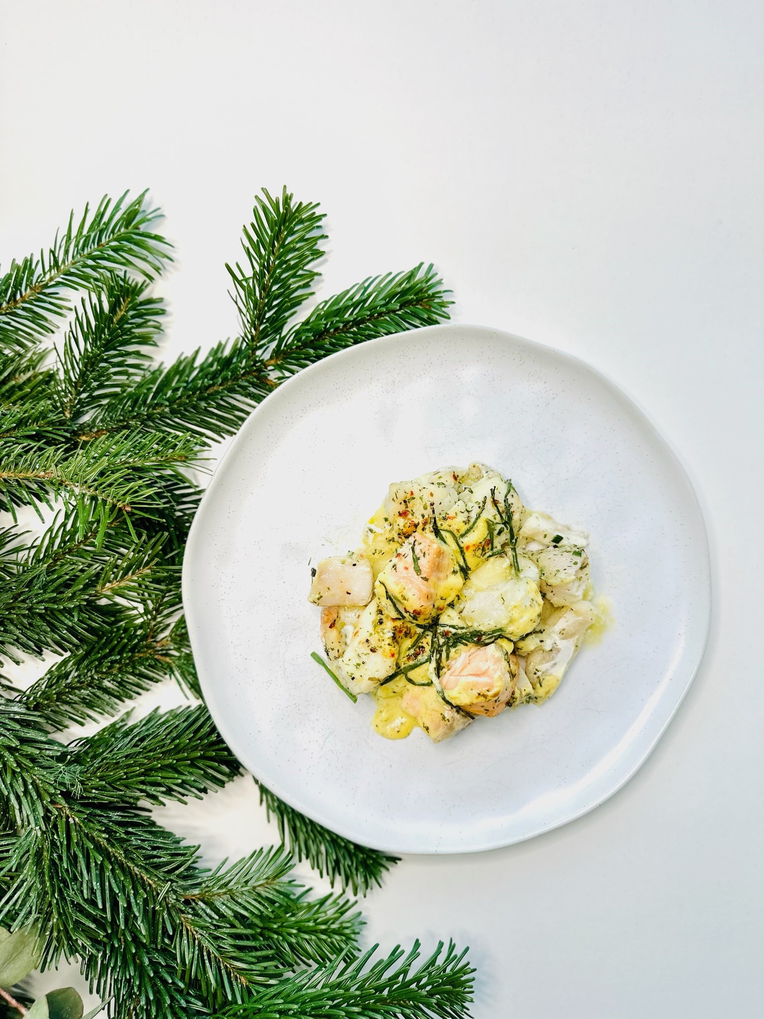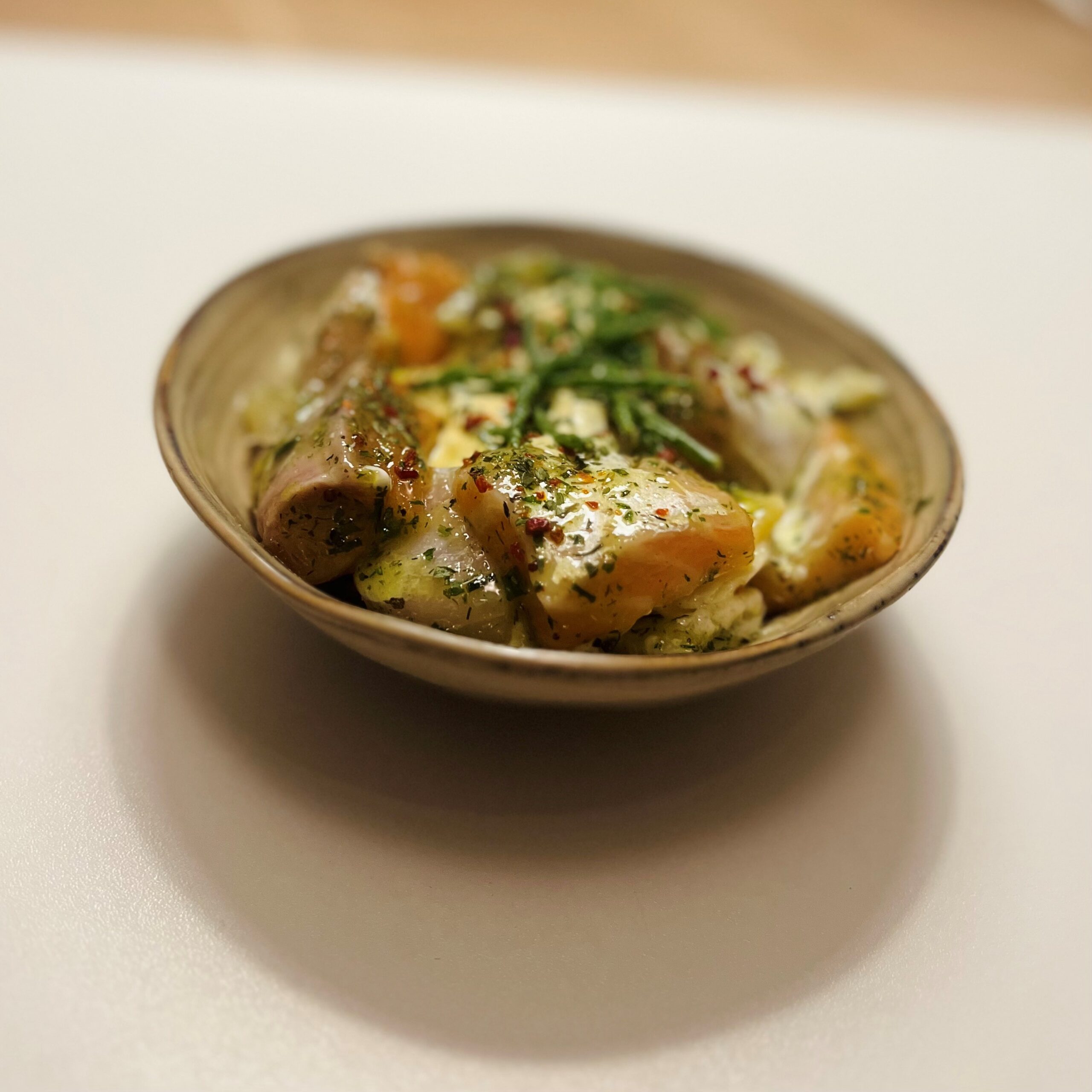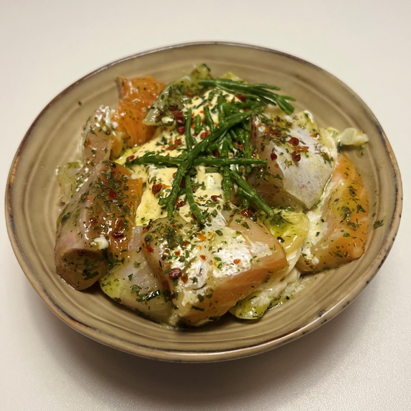 Vers vispannetje zalm en kabeljauw met onderin aardappel gratin. De heerlijke saus en zeekraal maakt het af.
