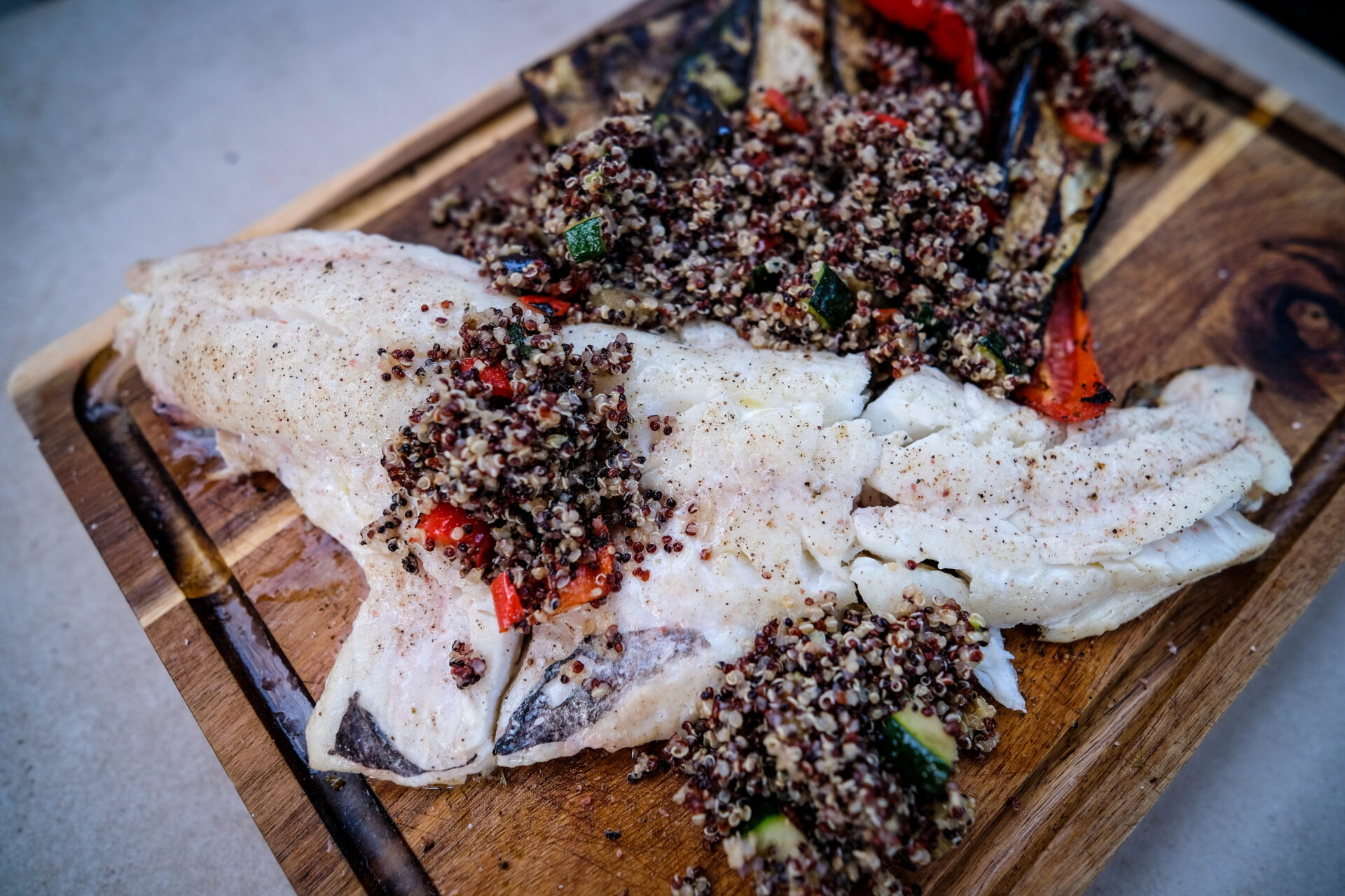 Gegrilde skrei met mediterrane groente en quinoa